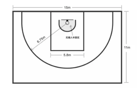 標準的三人籃球比賽場地面積15米(寬) ×11米(長);場地須具有一個標準籃球場尺寸的區(qū)域,包括一條罰球線( 5.80米)、一條兩分球線(6.75米)以及球籃正下方的一個“無撞人半圓區(qū)”。(如下圖所示)